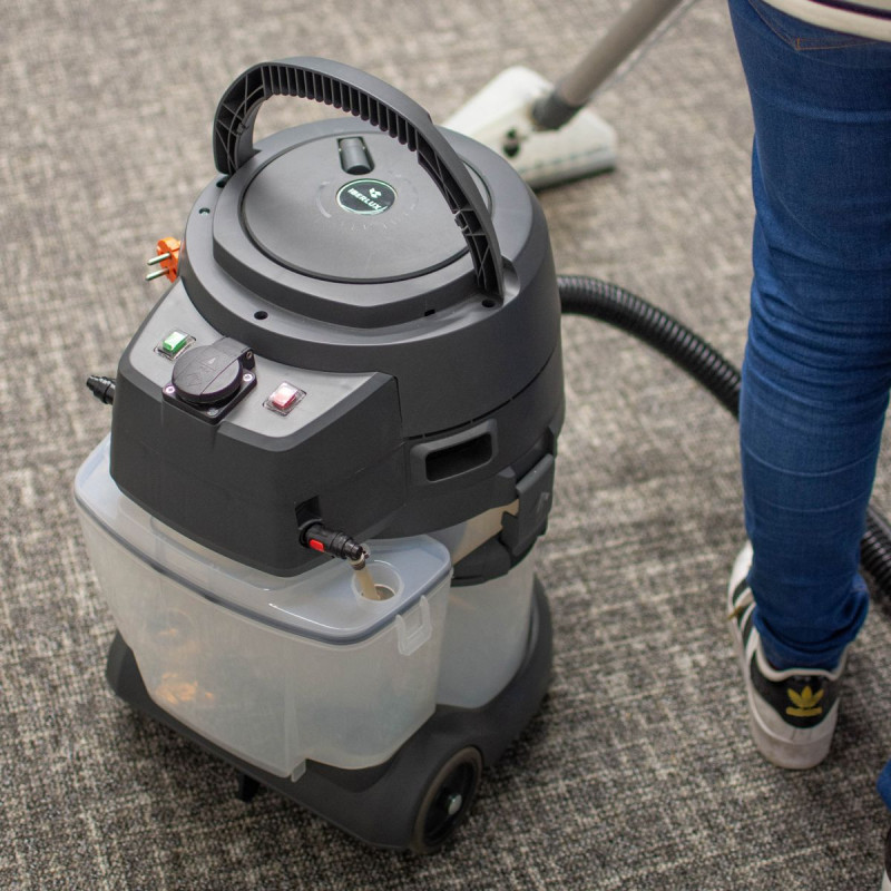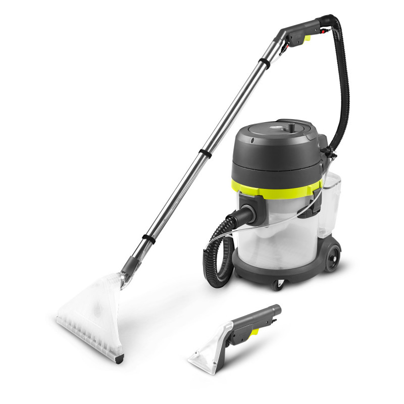 Este es un aspirador de inyección y extracción profesional diseñado para limpiar tanto superficies blandas ( alfombras, moquetas, tapicería de automóviles y del hogar) como superficies duras ( baldosas, terrazo y vinilo). Está equipado con un enchufe adicional para conectar el Cepillo Eléctrico DP 55.