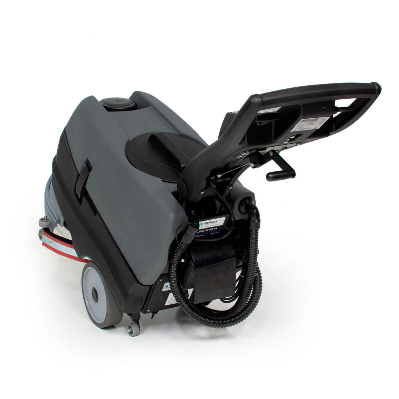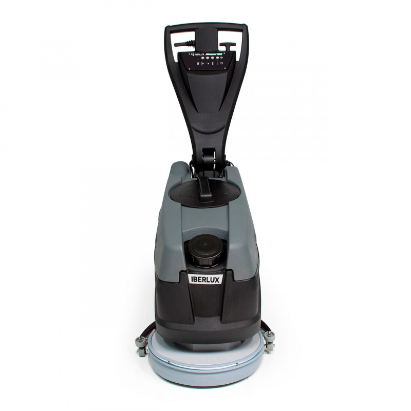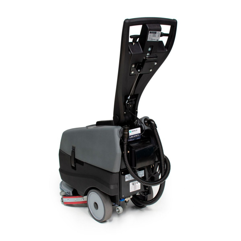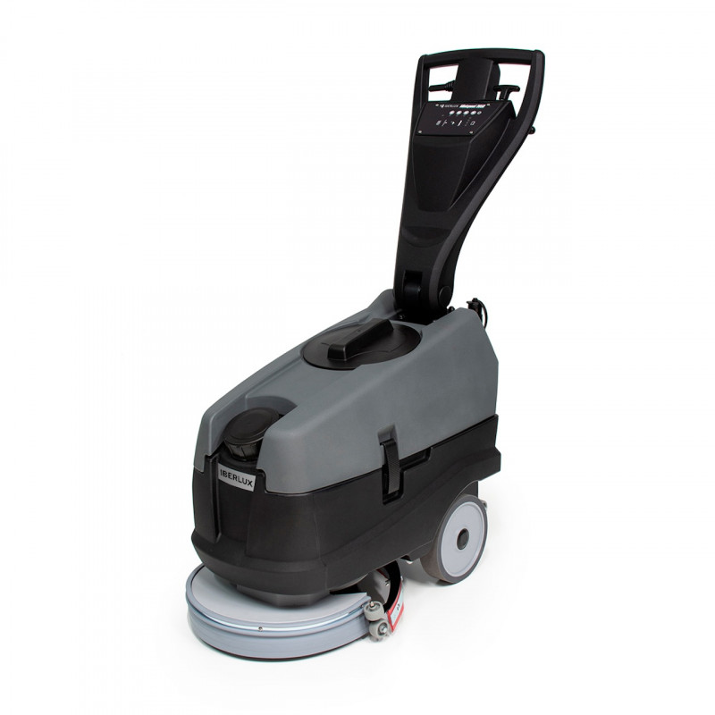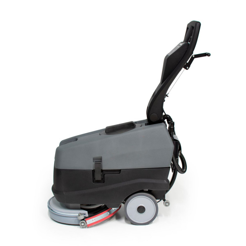 Fregadora de suelos compacta a baterías, 36cm de ancho de trabajo, 17 y 18 Litros de capacidad de los tanques de agua limpia y agua sucia. Esta máquina es ideal para la limpieza de pequeñas superficies con obstáculos como gimnasios, tiendas, clínicas, pequeños almacenes etc.
