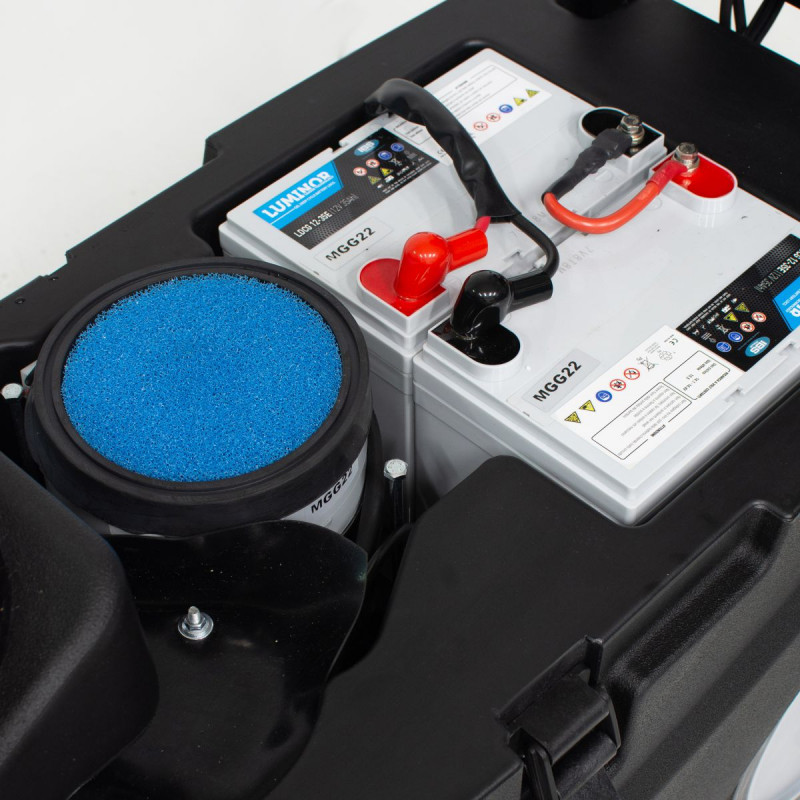 • Batería de Gel sin mantenimiento y 1,5h de autonomía o batería de Litio de carga rápida (2h).